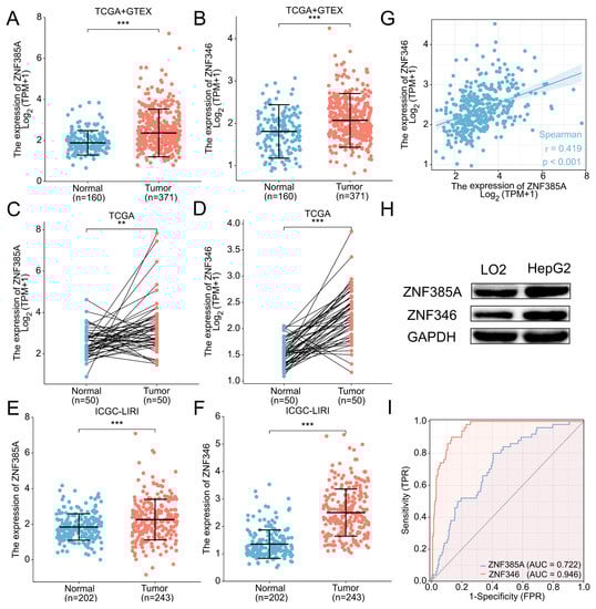 ZNF385A and ZNF346 are overexpressed in HCC, and their diagnostic potential. (A,B) ZNF385A and ZNF346 mRNA expression in 371 HCCs, and 160 adjacent normal tissues from the TCGA and GTEx databases. (C,D) ZNF385A and ZNF346 mRNA expression in paired tumor and adjacent normal tissues of 50 patients with HCC in TCGA. (E,F) ZNF385A and ZNF346 mRNA expression from the ICGC database. (G) Correlation scatter plot of ZNF385A and ZNF346. (H) Validation of ZNF385A and ZNF346 protein levels in normal liver cell (LO2) and HCC cell (HepG2) via Western blot analysis. (I) ROC curves to test the diagnostic value of ZNF385A and ZNF346. ** p < 0.01; *** p < 0.001.