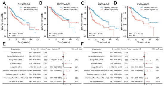 ZNF385A and ZNF346 predict a poorer prognosis in HCC. (A–D) Survival curves of OS and DSS between high and low ZNF385A, and ZNF346 expression subgroups in HCC. (E,F) Univariate and multivariate Cox regression analyses of ZNF385A (E) and ZNF346 (F) for clinical factors.