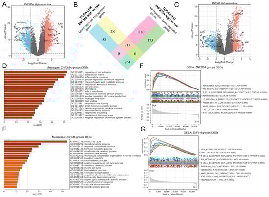 To determine the underlying functions and mechanisms of ZNF385A and ZNF346, we calculated the differentially expressed genes (DEGs) between the ZNF385A and ZNF346 high and low expression groups. A total of 1834 (Figure 4A) and 748 (Figure 4C) DEGs for ZNF385A and ZNF346 were identified, respectively. Interestingly, there was a notable proportion of overlap between these DEGs (Figure 4B), which proved that ZNF385A and ZNF346 may have certain commonalities in the carcinogenic mechanism in HCC. The ZNF385A- and ZNF346-related genes were further mapped into the Metascape database for gene ontology (GO) enrichment analysis. ZNF385A was mainly involved in cell adhesion and immune response (Figure 4D), and for ZNF346, cell cycle process was mainly enriched (Figure 4E). Both of them were notably associated with the inflammatory response. We further performed gene set enrichment (GSEA) analysis to explore signaling pathways that were markedly associated with ZNF385A and ZNF346. Many oncogenic signaling pathways of liver cancer were enriched in the ZNF385A and ZNF346 high expression groups, which included the p53 signaling pathway, apoptosis, adherens junctions, the VEGF signaling pathway, the Wnt signaling pathway, and the cell cycle process (Figure 4F,G). Adherens junctions and the cell cycle are closely associated with cell migration and proliferation []. Furthermore, high expression groups showed the statistical enrichment of immune-related signaling pathways, such as T cell receptor signaling, B cell receptor signaling, and Fc gamma R-mediated phagocytosis pathways (Figure 4F,G). On the other hand, for the 217 intersecting up-regulated genes, 210 genes (97%) were risk factors for the unfavorable survival of HCC, of which 123 (57%) were statistically significant (Figure S6A). Similarly, for the 264 intersecting down-regulated genes, 258 genes (98%) were favorable for survival, of which 121 (46%) reached statistical significance (Figure S6B). Altogether, these provided evidence that ZNF385A and ZNF346 may contribute to the malignant behaviors of HCC cells, and they were associated with immune and inflammation responses.