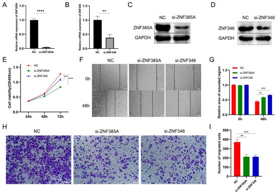 To validate the biological function of ZNF385A and ZNF346 in HCC, we performed loss-of-function experiments by transfecting small interfering RNA (siRNA) into HepG2 cells. The effectiveness of ZNF385A and ZNF346 knockdown was determined using quantitative reverse transcription PCR (RT-qPCR) and Western blot (Figure 5A–D). The cell counting kit-8 (CCK-8) assay demonstrated that a lower expression of ZNF385A and ZNF346 drastically reduced the cell viability of HepG2 cells (p < 0.01) (Figure 5E). Then, the wound healing assay and transwell assay indicated that the knockdown of ZNF385A and ZNF346 significantly inhibited the migration capacity (p < 0.01) (Figure 5F–I).