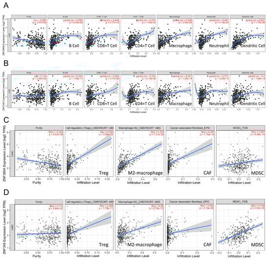 Correlation analyses between ZNF385A and ZNF346 expression, and the immune infiltration of multiple immune cells. (A,B) Correlation with six main infiltrating cells in HCC via TIMER. (C,D) Correlation with four immunosuppressive cells in HCC via TIMER2.