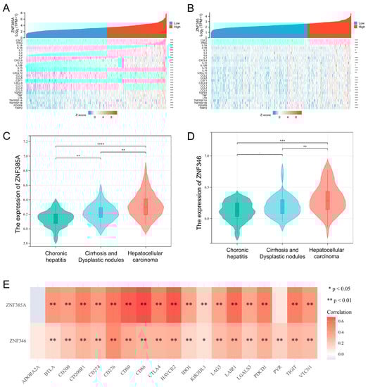 The analysis on the expression of inflammatory cytokines in the ZNF385A and ZNF346 subgroups showed significantly higher levels of various inflammatory molecules in the ZNF385A- and ZNF346-high expression groups, including IL-1α, IL-1β, IL-10, and so on (Figure 7A,B). We downloaded the gene expression profiles of 94 samples covering different stages of HCC from GSE89377, found that the expression of ZNF385A and ZNF346 gradually increased from chronic hepatitis to liver cirrhosis and HCC (Figure 7C,D). This result indicated that ZNF385A and ZNF346 may participate in the inflammation response and liver carcinogenesis. Long-term exposure to chronic inflammation also leads to T-cell exhaustion by elevating the expression of checkpoint receptors []. It was identified that both ZNF385A and ZNF346 were significantly and positively correlated with most inhibitory immune checkpoints, including PD-1, PD-L1, IDO1, CTLA-4, TIGIT, LAG-3, and TIM-3 in HCC (Figure 7E). In combination with the above analysis, ZNF385A and ZNF346 overexpression were associated with an immunosuppressive TME and chronic inflammation.