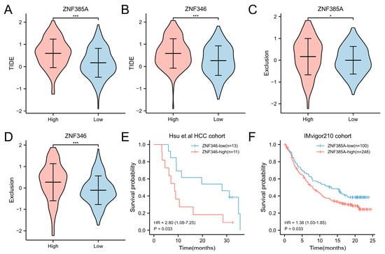 Given the relevance of ZNF385A and ZNF346 to an immunosuppressive TME, it was hypothesized that the high expression of ZNF385A and ZNF346 may lead to immunotherapy resistance. We used the Tumor Immune Dysfunction and Exclusion (TIDE) score to assess the efficacy of immunotherapy in different ZNF385A and ZNF346 subgroups. The results revealed that high ZNF385A and ZNF346 expression groups exhibited higher TIDE (Figure 8A,B) and T-cell exclusion scores (Figure 8C,D), indicating poor immune checkpoint inhibitors (ICI) efficacy and a shorter survival time after ICI treatment. We then aimed to validate the prognostic significance of ZNF385A and ZNF346 for immunotherapy. Hsu and colleagues tested 770 genes from 24 HCC patient samples with anti-PD-1/anti-PD-L1 treatment []. Within this cohort, the ZNF346-high group had worse OS than the ZNF346-low group, which was consistent with the TIDE prediction (Figure 8E). Since ZNF385A was not tested in Hsu HCC cohort, we introduced the IMvigor210 cohort (a trial investigating the clinical activity of anti-PD-L1 atezolizumab in metastatic urothelial carcinoma) []. Likewise, a high ZNF385A mRNA expression correlated with a poor survival prognosis (Figure 8F).