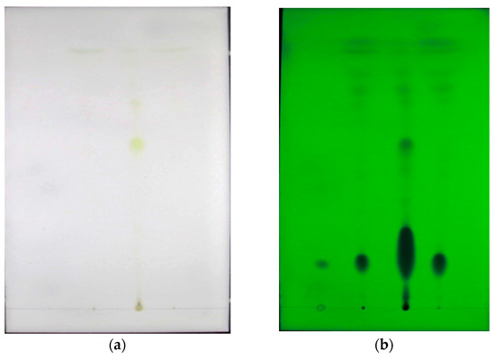 (a) UV detection. (b) TLC detection (the sample points in the two TLC plates, from left to right, are standard hydroxyl-α-sanshool and the starting point, peak point, and end point of the target fractions, respectively).