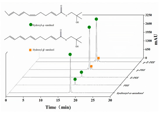External calibration curve method: The concentrations of hydroxyl-α-sanshool in PEE, E-PEE, p-PEE, and p-E-PEE are calculated based on the standard curve line of hydroxyl-α-sanshool, according to the results of HPLC detection. Then, the ratio of the calculated concentration of hydroxyl-α-sanshool, which is calculated by the method of the external calibration curve to the concentration of the configuration solution (0.5 mg/mL), is the purity of the hydroxyl-α-sanshool. The concentration of the configuration solution is determined by a certain weight extract (PEE, E-PEE, p-PEE, and p-E-PEE) dissolved in an acetonitrile–water solution.