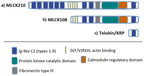 Myosin Light Chain Kinase gene (MYLK) products; schematic representation of each protein and its domain structure. The gene MYLK encodes 3 proteins: MLCK210 (210–220 kDa), MLCK108 (110–140 kDa), and telokin/kinase-related protein (KRP) (based on [44,46]).