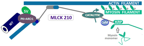 MLCK210 is a signal integrator molecule containing several interaction sites for cytoskeletal and regulatory proteins (based on [44,45]). Adapted with permission from Ref. [44], Shirinsky, V.P. (2012). MYLK (Myosin Light Chain Kinase). In: Choi, S. (eds) Encyclopedia of Signaling Molecules. Springer, New York. https://link.springer.com/referenceworkentry/-10.1007/978-1-4419-0461-4_248#citeas, license number 5481371185567/2023, Legend: CaM—calmodulin, KRP—kinase-related protein domain, MT—microtubules, PK+ARD1—Protein kinases and ARD1 acetylase that modify MLCK210 residues, SV—supervillin (a membrane-associated scaffolding protein interacting with MLCK210 N-terminus and with myosin II).