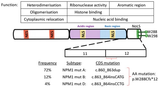 NPM1 is localised to chromosome 5q35 and consists of 12 exons. Specifically, NPM1 contains the N-terminal core domain, acidic domain, and nuclear localisation signal domain are found to be highly conserved among each protein of the NPM family, indicating that all three proteins have a similar functional role. However, the less conserved C-terminus, on the other hand, suggests an alternative role for NPM1. It is highly conserved between metazoans and when mutated can result in leukaemic-initiating activity [1]. The NPM1-mutated gene is a dominant negative, haploid insufficient mutation that is generally limited to exon 12 [2,3], although rare occurrences have been reported in other regions such as exon 5, 9, and 11 [4,5]. NPM1-mutated AML is mostly categorized into type A, B, or D according to a 4 base-pair insertion sequence at the 288th amino acid position (rs587776806) [6]. Type A (sequence: TCTG) is the most frequent, comprising of approximately 72% of NPM1-mutated AML cases. Types B (sequence: CATG) representing ~12% and D (sequence: CCTG) with ~4% are less frequent but more so than all other types which represent less than 1% of the NPM1 mutated population (Seen in Figure 1) [6,7]. The frameshift resulting from NPM1 mutant insertions causes a change in the C-terminal domain (CTD) amino acid sequence from DLWQWRKSL to DLC(L/M)AVEEVSLRK, consequently replacing one or both tryptophan residues that are required for nucleolar localisation signaling with a nuclear export signal (NES) motif, i.e., LXXX(V/L/F/C/M)XXVXL, where X stands for any residue [2,3,6,7]. Since NPM1 proteins interact with a shuttling receptor XPO1, also known as Exportin, the mutant protein is exported at rates exceeding that at which it is imported, ultimately leading to the delocalisation of mutant NPM1 to the cytoplasm [3]. Wild type (WT) NPM1 is also shuttled out of the nucleus in the process, as NPM1-mutant and NPM1-WT form heterodimers to be co-exported [8].