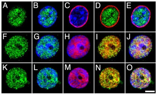 - Fey, E.G.; Krochmalnic, G.; Penman, S. The Nonchromatin Substructures of the Nucleus: The Ribonucleoprotein (RNP)-Containing and RNP-Depleted Matrices Analyzed by Sequential Fractionation and Resinless Section Electron Microscopy. J. Cell Biol. 1986, 102, 1654–1665. [Google Scholar] [CrossRef] [PubMed]