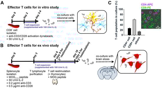 For the ex vivo study, we primed the T cells with the CNS antigen, MOG peptide, via antigen-presenting cells in the splenocytes. This priming led the T cells to specifically recognize myelin on neurons. Naive T cells embedded in the splenocytes were primed with 75 µg/mL MOG35-55 peptide supplemented with 50 U/mL mouse IL-2 and a small amount of suspended anti-CD3 and anti-CD28 antibodies to assist T cell activation. After expanding the MOG-specific T cells, we performed Ficoll density gradient centrifugation to purify the lymphocyte population from the splenocyte pool. Effector T cells were used to co-culture with the brain slices for functional assay after the second cycle of stimulation (second restimulation) (Figure 2B). We analyzed the MOG-specific lymphocyte population isolated from the WT mice in the culture by labeling anti-CD4 and anti-CD8 antibodies on these cells. In the second cycle of stimulation, on day 4, 61.9 ± 2.9% of these cultures were composed of CD8+ cells, 25.5 ± 2.0% of CD4+ cells, and 12.6 ± 2.7% of CD8-CD4− cells. The double-negative cells were most likely B lymphocytes (Figure 2C). Notably, the MOG-specific T cells generated from the WT mice and CD8cre-τGFP transgenic mice yielded lymphocyte populations of similar composition in the culture, using the protocol described in Figure 2B. We applied these restimulated MOG-specific lymphocytes to the brain slices for the ex vivo study. Of note, the protocols for preparing cortical neuronal culture and acute brain slices used for measuring neuronal activity and neurogeneration [25,26,27,28,29], as well as effector T cells [30,31] and their co-culture with neurons to investigate T cell effector function and interplay with neurons, have been reported before [32,33,34]. Here, we describe cortical cultures adapted to our experimental needs, followed by effector T cell co-cultures.