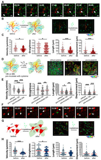 We examined the effects of immediate (Figure 3B,C) and prolonged treatment with cytokines (12 and 24 h; Figure 3D,E) to mimic inflammation by applying the cytokine cocktail to the neuronal culture in vitro. CD8+ T cells exhibited reduced migration velocity and altered migration patterns under all these conditions compared to the untreated groups. Moreover, the changes in T cell migration were similar in the inflamed cortical brain slices ex vivo (Figure 3G,H). These results indicate that the T cells responded similarly to the inflammatory conditions in both models.