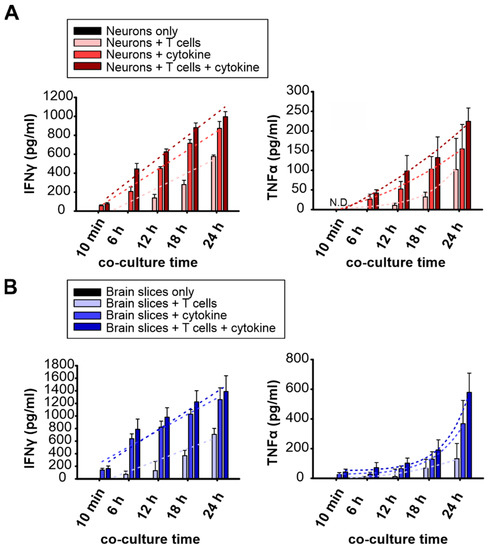 Proinflammatory cytokine release in neuronal culture and brain slices during T cell co-culture. Culture media were collected from (A) in vitro T cell–neuron co-culture or (B) ex vivo T cell–brain slice co-culture after 10 min, 6 h, 12 h, 18 h, and 24 h. IFNγ data were linearly fit. TNFα data were fit with an exponential growth function (stipple lines). Released IFNγ or TNFα from the different culture conditions were measured by ELISA. ELISA measurements were performed from four independent preparations, with one technical replicate from each preparation. N.D. stands for nondetectable.