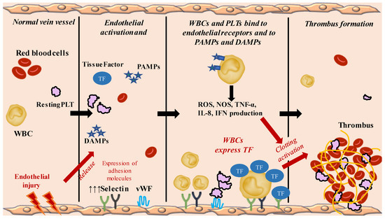 The pathogenesis of VTE is, however, complex, and other mechanisms, including endothelial damage, macrophages, red blood cells and platelets (PLTs), have been investigated [25].