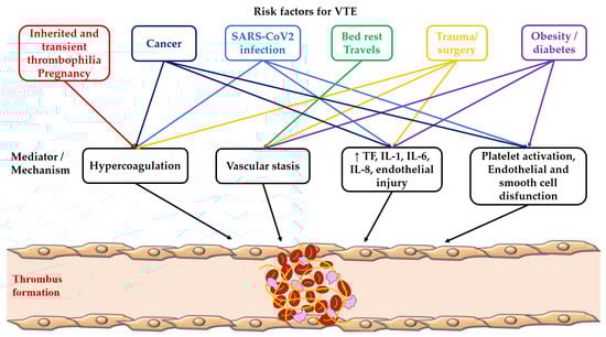Venous thromboembolism (VTE) is the third most common cause of death worldwide. The incidence of VTE varies according to different countries, ranging from 1–2 per 1000 person-years in Western Countries, while it is lower in Eastern Countries (<1 per 1000 person-years). Many risk factors have been identified in patients developing VTE, but the relative contribution of each risk factor to thrombotic risk, as well as pathogenetic mechanisms, have not been fully described. Herewith, we provide a comprehensive review of the most common risk factors for VTE, including male sex, diabetes, obesity, smoking, Factor V Leiden, Prothrombin G20210A Gene Mutation, Plasminogen Activator Inhibitor-1, oral contraceptives and hormonal replacement, long-haul flight, residual venous thrombosis, severe acute respiratory syndrome coronavirus 2 (SARS-CoV-2) infection, trauma and fractures, pregnancy, immobilization, antiphospholipid syndrome, surgery and cancer. Regarding the latter, the incidence of VTE seems highest in pancreatic, liver and non-small cells lung cancer (>70 per 1000 person-years) and lowest in breast, melanoma and prostate cancer (<20 per 1000 person-years). In this comprehensive review, we summarized the prevalence of different risk factors for VTE and the potential molecular mechanisms/pathogenetic mediators leading to VTE.