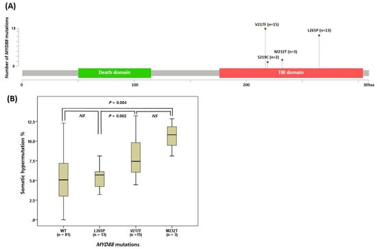 - de Groen, R.A.; Schrader, A.M.; Kersten, M.J.; Pals, S.T.; Vermaat, J.S. MYD88 in the driver’s seat of B-cell lymphomagenesis: From molecular mechanisms to clinical implications. Haematologica 2019, 104, 2337. [Google Scholar] [CrossRef]