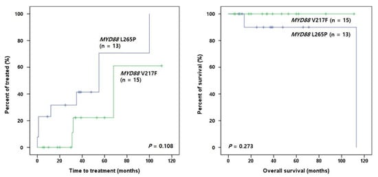 - Rovira, J.; Karube, K.; Valera, A.; Colomer, D.; Enjuanes, A.; Colomo, L.; Martínez-Trillos, A.; Giné, E.; Dlouhy, I.; Magnano, L. MYD88 L265P mutations, but no other variants, identify a subpopulation of DLBCL patients of activated B-cell origin, extranodal involvement, and poor outcome. Clin. Cancer Res. 2016, 22, 2755–2764. [Google Scholar] [CrossRef]