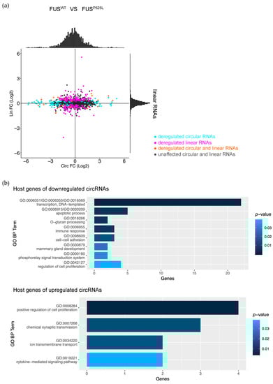 Effect of FUS mutation on circRNA production in mature motor neurons. (a) Scatter plot showing the change in the expression of circRNAs (x-axis) and their cognate linear RNAs (y-axis) in FUSP525L MNs with respect to FUSWT MNs. The distributions of the log2 fold change (FC) values are shown above and aside the scatter plot. Turquoise dots are used to indicate when only the circRNA is deregulated (p-value < 0.05); magenta dots when only the linear RNA is deregulated (p-value < 0.1); orange or black dots when both the circRNA and the linear counterpart are deregulated or unaffected, respectively. (b) Enriched GO Biological Process terms identified in the host genes of downregulated and upregulated circRNAs. The x-axis represents the number of host genes belonging to the category reported in the y-axis. Color intensity is proportional to the enrichment p-value. Redundant categories were manually clustered; when multiple GO IDs are reported, they represent all the categories contributing to the cluster, for which a single description is reported, corresponding to the category with the lowest p-value.