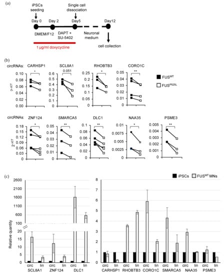 Using MNs in vitro-derived from FUSWT and FUSP525L iPSCs-NIL (day 12; Figure 4a) we confirmed the deregulation obtained from the RNA-Seq analysis for all the selected circRNAs (Figure 4b). We also observed that both the circRNAs and their linear counterparts were upregulated during MN differentiation (Figure 4c). The only exceptions are circCARHSP1 and circPSME3, which do not show any increase; however, it is interesting to note that their linear counterparts are instead downregulated upon MN differentiation, suggesting an independent biogenesis of the two transcript isoforms (Figure 4c).