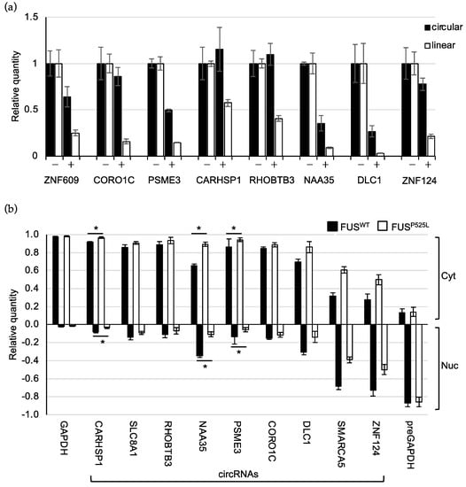Since the P525L FUS mutation causes a prominent delocalization of the protein in the cytoplasm of MNs, we tested whether, besides affecting circRNA expression levels, mutant FUS might also have an impact on their nuclear/cytoplasmic partitioning [43].