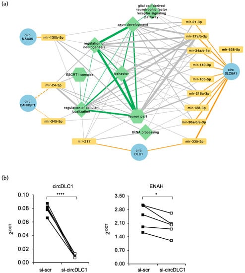 circRNA–miRNA–mRNA network inferred from high-throughput data. (a) The network reports the downregulated cytoplasmic circRNAs predicted to act as sponges for miRNAs expressed in MNs. Orange edges connect circRNAs to miRNAs, for which they have at least two predicted binding sites, or at least one binding region spanning the back-splicing junction (dashed lines), the edge width being proportional to the number of sites. Green nodes correspond to the GO Biological Process (hexagons) or Molecular Function (diamonds) terms enriched among all the known or predicted targets of sponged miRNAs (see Materials and Methods); only targets whose mRNA and/or protein are downregulated upon FUS mutation were used. Gray edges connect miRNAs to the functional categories to which at least one target belongs, the edge width being proportional to the number of targets. Green edges connect categories with at least one target gene in common, the width being proportional to the number of shared genes. (b) Plots showing the levels of the circDLC1 and ENAH mRNA measured by quantitative Real-Time PCR in MNs treated with si-circDLC1 and with si-scr as the control. RNA levels were quantified using ATP5O mRNA levels as the reference and expressed as 2 ^-ΔCT. Values from all the biological replicates (n = 5) are shown. p-values were calculated using paired two-tailed Student’s t-test (* p < 0.05 and **** p < 0.0001).