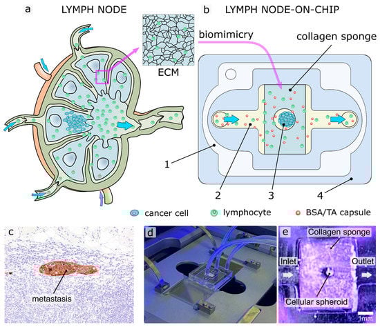 Engineering of LNOC. Schematic of the human native lymph node (a) and LNOC structure (b), reproducing structural features of LN with secondary tumor. 1—suction cup; 2—main channel; 3—cellular spheroid; 4—chip body. Cells stained in blue—secondary tumor cells, green—lymphocyte; red—capsules. (c) Secondary tumor due to metastasis in the sentinel lymph node (keratin stain). Reprinted with permission from Elizabeth Euscher (2020) []. (d) Photo of chip installed in the Operetta CLM system. (e) Macrophotograph of the assembled and ready to use chip.