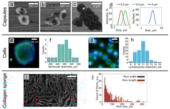 (a–c) SEM images of polymer capsules of (a) 0.3, (b) 0.5 and (c) 4 µm diameter. (d) Plots of size representation of polymer microcapsules obtained by DLS. (e) Fluorescence microphotograph of 4T1 cellular spheroid (Alexa Fluor 488 is green fluorescence, Hoechst is blue fluorescence). (f) Spheroids size distribution. (g) Fluorescence microphotograph of Jurkat cells (Alexa Fluor 488 is green fluorescence, Hoechst is blue fluorescence). (h) Jurkat cell size distribution. (i) SEM image of collagen sponge. (j) Size distribution of meshes in collagen sponge.