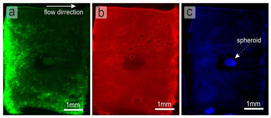 The volume flow rate through the LNOC was 0.65 mL/h, assuming that volumetric lymph flow in the rat lymph vessels is in the range of 0.1–1 mL/h []. On the individual fluorescence channels, the following became clearly visible: (1) 300 nm capsules evenly filled the collagen sponge and passed through it (Figure 3b). (2) Channels in the sponge are not equal and have some distribution in shape and size, as shown by SEM section of Figure 2i and presented in Figure 2j. However, it can be seen that lymphocytes also pass through the sponge and are present in every part of it. As expected, the maximum fluorescence intensity of lymphocytes is directly opposite the innlet channel of the microfluidic chip (Figure 3a) and gradientally decreases to the borders of the collagen sponge (to the top and to the bottom site).