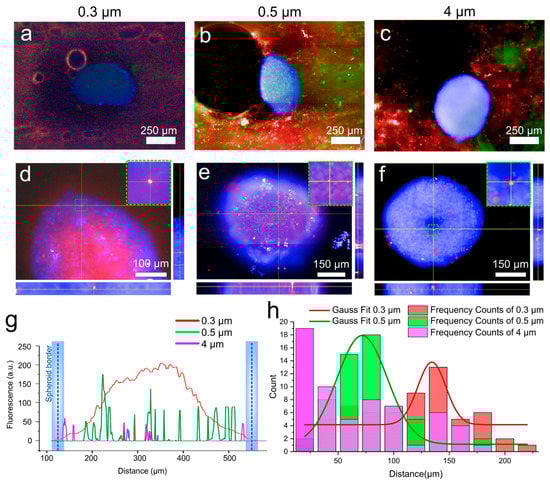 The efficiency of capsule passage through the collagen sponge was assessed by confocal microscopy. For this purpose, we first assessed the presence of lymphocyte cells and polymer capsules in the sponge around the cell spheroids (Figure 4a–c). As can be seen from the fluorescence micrographs, capsules and cells successfully pass through the sponge surrounding the spheroid. In all cases, the spheroids slightly change their morphology because they are pressed against the sponge wall by the flow. Such changes in spheroid morphology are considered to be normal in the shear stress for cancer and normal cells in 2D and 3D matrixes [,]. The total duration of the experiment was one hour, of which 30 min the spheroid was in the sponge under flow conditions, and 30 min without flow, so that the capsules that hit the membrane could be better absorbed by the surface of the cells. To evaluate the passage of capsules and lymphocyte cells through the collagen sponge, and especially through the spheroid, we took fluorescence microphotographs of the sponge with the spheroid around it showing green and red fluorescence, which indicates the successful passage of capsules regardless of size. Such a method was developed for the least losses during extraction of the spheroid from the sponge. After extraction, the spheroid was transferred to an empty plate, where it was also examined using confocal microscopy. By creating an orthogonal projection, we can clearly see the distribution of capsules inside the spheroid (Figure 4e,f). Capsules of 0.3 µm in size entered the inside of the spheroid in large numbers, which can clearly be seen in Figure 4d. Larger diameter capsules enter the spheroid to a much lesser extent. For example, 0.5 µm capsules are also present both on the upper cell layers and inside the spheroid itself, which can be clearly seen in Figure 4e. Particles of 4 µm are the least internalized. Only single capsules are observed in the center of the spheroid. There is a large amount of literature data, which indicates that the intercellular distance in the spheroid can reach from 20 to 500 µm []. However, the objects falling into the intercellular space can be larger, which depends on such parameters as the density of the intercellular matrix, and as in the case we describe the presence of the medium flow around the spheroid []. Our assumptions are also confirmed by the fluorescence profiles taken from cell spheroids with internalized capsules (Figure 4g). As can be seen from the graph, the highest signal was obtained from the spheroid, which was in the flow of 0.3 µm capsules. Further, depending on the size, the number of particles decreased significantly. To obtain quantitative data, we calculated capsule penetration depths for all three sizes (Figure 4h). The data were presented as frequency counts and Gaussians for these frequencies. Such a calculation allows us to determine the largest clusters of particles as a function of penetration depth. As can be seen in Figure 4h, most 4 µm particles accumulate mainly at the surface of the spheroid, 0.5 µm particles accumulate at a depth of ≈75 µm, as also seen from the Gaussian. Particles of 0.3 µm size penetrate most deeply into the cellular spheroid (≈125–150 µm from the surface).