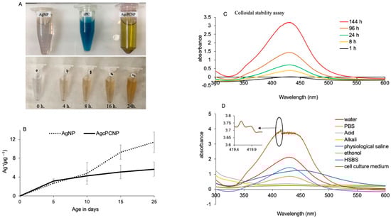 Color intensity changes during the different reduction incubation times in hr (A). Leaching of Ag+ per μg L−1 from AgNP and AgcPCNP over different days (B). Colloidal stability assay at different time periods from 1 h to 144 h (C). Stability of NPs in different solutions (D).