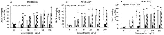 DPPH (A), ABTS (B), and FRAC (C) antioxidant assay. Antioxidant efficacy of AgNP, AgcPCNP and cPC was conducted with varying concentration of 0, 5, 10, 25, 50 and 100 μg L−1. All experiments were conducted in three independent sets and p < 0.05% was set as the significant level between each group and compared with the untreated control group (* p < 0.05).