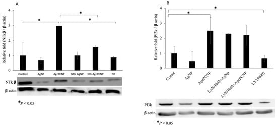 NFĸB (A) and PI3K (B) protein expression patterns as revealed by Western blot analysis. Cells were treated with or without Nfi (NFĸB pathway inhibitor) and Ly294002 (PI3K pathway inhibitor), along with AgNP and AgcPCNP groups. βactin was used as a loading control. Relative fold expressions were calculated in each experimental set and * p < 0.05% was set as the significant level between each group and compared with the untreated control group.