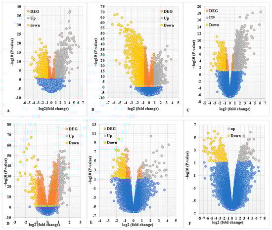 Identification of DEGs by volcano plot for PCa. Volcano plot for six GEO microarray datasets: (A): GSE46602, (B): GSE38241, (C): GSE69223, (D): GSE32571, (E): GSE55945, and (F): GSE26126. The criteria of DEGs cutoff standard are p-value < 0.05 and |log2FC| (fold change) > 1. Color code—gray: up-regulated genes; yellow: down-regulated genes; orange: no change in expression levels of DEGs; blue: non-DEGs).