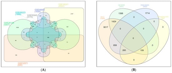 Venn diagram of the: (A) overlapping DEGs from six GEO microarray datasets for PCa, 369 DEGs were identified among the six GEO microarray datasets; and (B) DEGs (11668), up-regulated genes (2931), down-regulated genes (2832), and overlapping DEGs (369) from GEO microarray datasets for PCa. Overlapping up-regulated (109) and down-regulated (260) DEGs were identified. Color code.