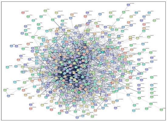 Tool for the Retrieval of Interacting Genes (STRING) version 11.5 was implemented to construct an analysis of direct and indirect PPI networks. STRING is an online database tool (http://string-db.org/, accessed on 25 March 2022) that performs as an access point for interpreting relationships between diverse proteins on a genome-wide scale, which is beneficial for understanding protein interaction functions []. The analysis criteria conditions were human species, gene fusion databases, experiments, co-recurrence, local clustering coefficient 0.44, average node degree 7.59, PPI enrichment p-value < 1.0 × 10−16, and the minimum required interaction score of 0.4.