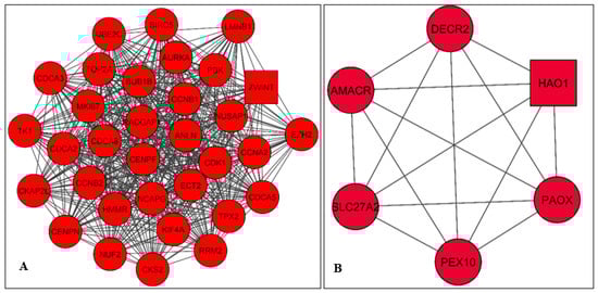 The two modules were generated from the DEGs PPI network by MCODE. (A) Module-1: associated with a score of 31.9, and includes 33 genes (nodes) and 511 edges. (B) Module-2: associated with a score of 6.0, consists of 6 genes (nodes) and 13 edges. Includes the top five clustered proteins (PEX10, SLC27A2, AMACR, PAOX, and DECR2), and one seed protein (HAO1) which is emphasized in the square node shape.