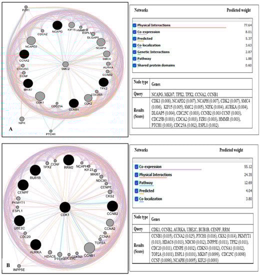 The network of hub genes (black circle), their related genes (gray circle), and the predicted weight percentages of the networks (physical interaction, co-expression, co-localization, genetic interaction, pathway, and shared protein domain) generated by GeneMANIA: (A) up-regulated hub genes with 25 genes were discovered with up-regulated genes and ordered with their score (circle size), and (B) down-regulated hub genes with 27 genes were discovered with down-regulated genes and ordered with their score (circle size).