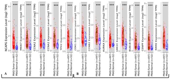 Differential analysis of expression of 12 hub genes between PCa (497) and normal prostate (52) tissues from Cancer Genome Atlas Prostate Adenocarcinoma (TCGA-PRAD) by TIMER: Tumor Immune Estimation Resource. (A): Query for 5 up-regulated hub genes. (B): Query for 7 down-regulated genes. ***: p-value < 0.001. TPM is transcripts per million with a normalization method for RNA-seq.