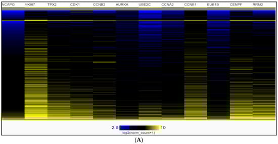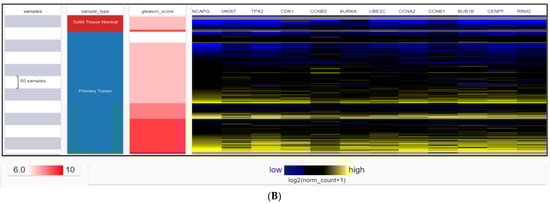 The hierarchical clustering of the heatmap indicated that hub genes could distinguish PCa samples from noncancerous samples (Figure 7). The heatmap of the hub genes in PCa groups was significantly expressed compared with the normal groups by UCSC-Xena (Figure 7A,B). In addition, the hub genes had the nearest association to the Gleason score (Figure 7). We adjusted the most elevated color according to 100% saturation parameters of log2 (norm_count + 1) ≥ 10.4, and the lowest color according to 100% saturation parameters of log2 (norm_count + 1) ≤ 2.65 (Figure 7A). We compared solid normal tissue to primary tumor tissue (Figure 7B). The results showed that MKI67, TPX2, CDK1, CCNB2, UBE2C, CCNA2, CCNB1, BUB1B, CENPF, and RRM2 were overexpressed consistently in the TCGA-PRAD 568 samples by utilizing gene expression RNAseq–IlluminaHiSeq with a max of log2 (norm_count + 1) = 10.4 and min of log2 (norm_count + 1) = 2.65. Consequently, these hub genes were closely interconnected to PCa carcinogenesis and higher Gleason score stages.