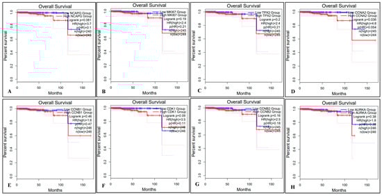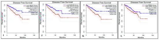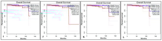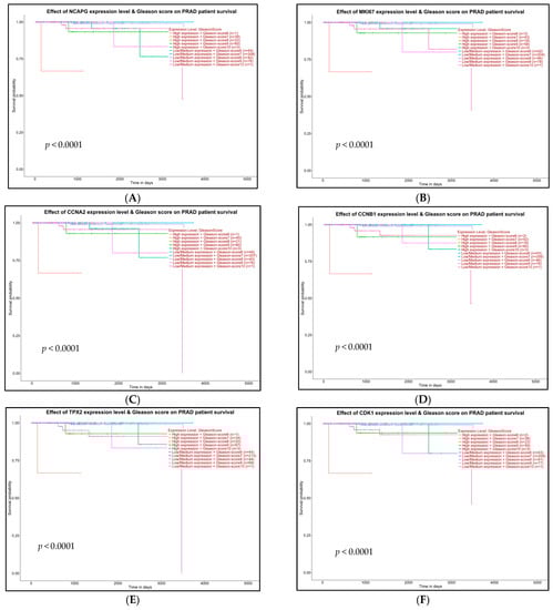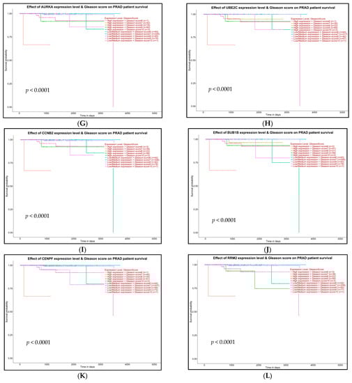 The effect of gene expressions on the TCGA-PRAD patients’ survival based on their Gleason scores was performed using UALCAN. We demonstrated that all up-regulated (NCAPG, MKI67, TPX2, CCNA2, CCNB1) and all down-regulated (CDK1, CCNB2, AURKA, UBE2C, BUB1B, CENPF, RRM2) genes significantly affected (p < 0.001) the Gleason scores and TCGA-PRAD patients’ survival, as shown in Figure 10A–L.