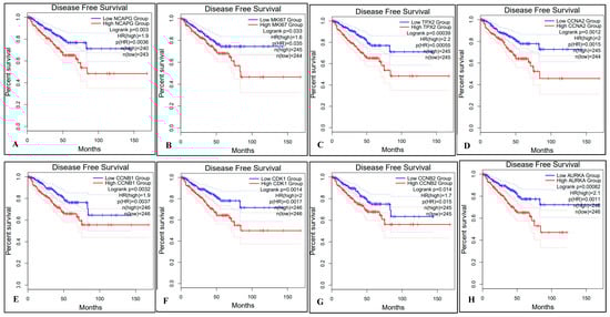 We used the TCGA-PRAD modules in GEPIA2 to analyze the differential expression of the hub genes between PCa and normal tissues. To evaluate the association between hub genes and the progression of PCa, we performed overall survival (OS) and disease-free survival (DFS) analyses using the GEPIA online tools as shown in Figure 8. The results showed CCNA2 (up-regulated) and CENPF (down-regulated), was significantly influenced (p-value < 0.05) in the OS of the PCa patients (Figure 8D,K). The expression changes of all other genes (high or low) showed no effect on the OS of PCa patients (Figure 8A–C,E–J,L). We further applied survival analysis to evaluate DFS utilizing the GEPIA2 online database as shown in Figure 9. Cox regression analysis showed that DFS of PCa patients was significantly affected due to all up-regulated (NCAPG, MKI67, TPX2, CCNA2, CCNB1) and down-regulated (CDK1, CCNB2, AURKA, UBE2C, BUB1B, CENPF, RRM2) genes as shown in Figure 9A–E and Figure 9F–L, respectively.