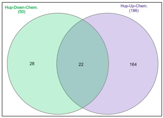 We conducted analyses of the curated studies on the CTD for gene–disease connections, chemical–disease relationships, and chemical–gene interactions [], and we utilized the PubMed database for cross-referencing. The Venn diagram (Figure 11) shows CTD analyses of chemicals that were associated with 5 up-regulated hub genes (NCAPG, MKI67, TPX2, CCNA2, CCNB1) and 7 down-regulated hub genes (CDK1, CCNB2, AURKA, UBE2C, BUB1B, CENPF, RRM2) associated with PCa in the CTD curated studies. There were 50 chemicals associated with the 5 up-regulated, and 186 chemicals associated with the 7 down-regulated hub genes. The overlapping 22 chemicals affecting the 12 hub genes were identified and listed in Table 3. Of the 22 identified chemicals, 17 were classified as recognized EDCs, and one chemical was carcinogenic.