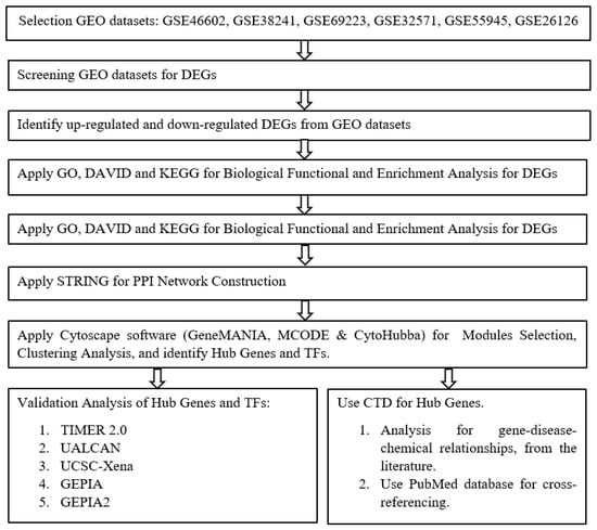 Microarray databases, high-throughput sequencing technology, and bioinformatics have played significant roles in the advancement of the medical field []. The Gene Expression Omnibus (GEO) online public microarray database allows analysis of differentially expressed genes (DEGs) that participate in biological processes (BP), cell components (CC), molecular functions (MF), gene regulatory networks, and pathways of PCa [,,,,]. However, prior studies of DEGs’ analyses indicated proximate limitations, such as no reliable biomarker specified to differentiate tumors from normal tissues [,]. Additionally, most studies have concentrated on the differences in expression between various samples, and gene-to-gene interactions were mainly overlooked [,,,,]. Single or multiple microarray datasets analysis in GEO has explored genes that play a significant role in the occurrence and progression of PCa, such as CASP5 and CASP8 [], CDH1 and EPCAM [], FOXO1 and NPM1 [], TWIST1 and VEGFA [], LMNB1 and ZWINT [], IGF2 and KRT8 [], PIK3R1 and ITGB4 [], PPARG and PRKAR2B [], CDCA8 and CDCA5 [], and CYP3A4 and CYP3A7 []. However, the critical genes identified in these earlier studies are distinguishable from each other and have little in common, which can be attributed to the heterogeneous nature of the PCa [].
