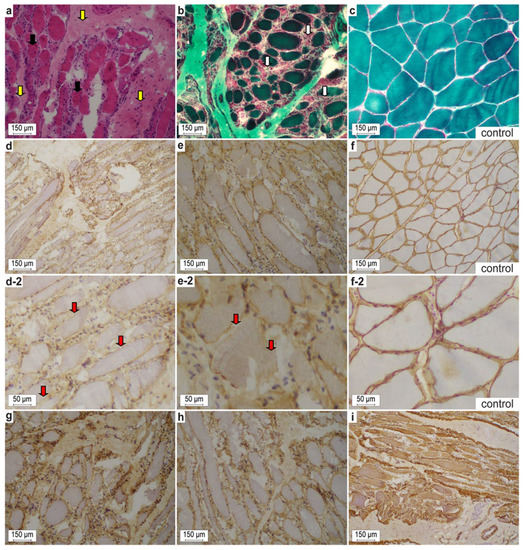 (a,b,d,e,g–i) Representative cryosections of the affected gastrocnemius muscle from the dystrophic Maine Coon crossbred domestic cat #1. (a,b) Noteworthy are the variability of myofiber sizes, degenerative (groups of necrotic fibers with myophagocytosis, white arrows) and regenerative muscle features (small fibers with prominent vesicular central nuclei; multiple nuclear internalization, black arrows), and endomysial fibrosis (yellow arrows) in affected cat #1. (d,e) On immunohistochemistry, membranous dystrophin often is discontinuous or even absent in between individual fibers (red arrows). Moreover, γ- and β-sarcoglycans (g,h) and desmin (i) were diminished and interrupted. (c,f) control sections from a European domestic shorthair cat. (a) H&E stain. (b,c) Gomori trichrome stain according to Engel. (d,f) Dystrophin 1 (1:100, DYS1). (e) Dystrophin 2 (1:100, DYS2) at regular and increased magnification. (g) γ-sarcoglycan (1:100, γ-SARC). (h) β-sarcoglycan (1:50, β-SARC). (i) desmin (1:50, Desmin Clone D33 M0760). (c,f) Control sections of a domestic short hair cat.