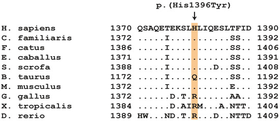 Analysis of the detected variants revealed only 18 private protein-changing variants in 13 genes (Table S3). Seventeen did not affect known musculoskeletal genes and thus were unlikely responsible for the myopathy in the index case. One single nucleotide variant (SNV) was in the DMD gene representing a prime candidate gene for a hereditary dystrophic myopathy. This DMD missense variant in exon 30 constitutes a G>A exchange at position 27,988,938 on the short arm of the X-chromosome, XM_045050787.1:c.4186C>T. This variant is predicted to result in a histidine-to-tyrosine substitution in the DMD protein, XP_044906722.1:p.(His1396Tyr). The predicted amino acid substitution lies within the spectrin 10 domain of the protein, which is conserved among mammals (Figure 3). The His1396Tyr substitution was not predicted to be pathogenic by several in silico prediction tools (Table 3). A homologous amino acid exchange, NP_003997.2:His1380Tyr, was observed once in the DMD gene of a hemizygous adult male person according to the gnomAD database but without further clinicopathological information. The gnomAD ID for the variant is “X-32429964-G-A” [42].