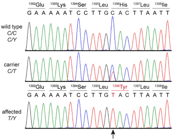 The presence of the DMD missense variant was confirmed by Sanger sequencing in both dystrophic male cats (Figure 4). The unaffected male littermate was hemizygous wildtype, while the female littermate and queen were heterozygous for the mutant allele (Figure 1d). The genotype–phenotype correlation was consistent for an X-linked recessive mode of inheritance. The variant was additionally genotyped in 277 control Main Coon cats and 320 additional control cats of diverse other breeds with similar sex distribution. None of these cats carried the mutant allele.