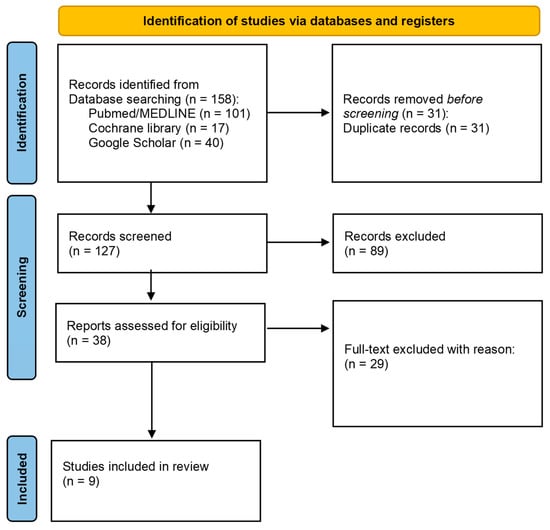 The initial search strategy provided a total of 158 articles: 101, 17, and 40 articles were found on PubMed/MEDLINE, Cochrane Library, and Google Scholar databases, respectively. After eliminating all duplicates, 127 possibly relevant studies were detected. In fact, a total of 31 duplicate articles were removed before the screening. After screening the articles’ titles and abstracts, 38 possibly relevant studies were detected for full-text examination. The final selection after full-text analysis included nine papers [,,,,,,,,]. A flowchart was drawn up describing the results of the study search and selection (Figure 1).