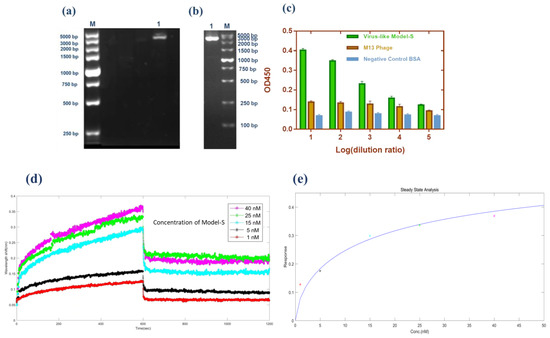 Validation of the Model-S. (a) Double digestion (SfiI/NotI) of pHB-S. Lane M: Marker; Lane 1: double digestion result. (b) PCR amplification of pHB-S. Lane M: Marker; Lane 1: PCR result. (c) Sandwich ELISA result from Model-S. Compared with the blank M13 phages and BSA, the results from Model-S were positive when combined with anti-SARS-CoV-2 spike antibodies. (d) Affinity analysis: interference shifts over time, reflecting the interference change caused by different concentrations. (e) Steady-state analysis: Response over the concentration of Model-S. (d,e) for the calculation of the affinity constant of Model-S.