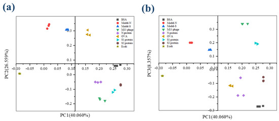 In PCA analysis, the cumulative contribution percentage can be accepted when reaching 60% and regarded as a good dimension reduction when reaching 80%. In this study, the cumulative contribution for the first four PCs was 81.949%, with approximately 19.000% of information lost. Therefore, the four components, PC1, PC2, PC3, and PC4, could explain the original variables well. According to the component matrix obtained from PCA reduction, the score scatters diagram for the nine samples were concluded and plotted under the coordinate PC1-PC2 and PC1-PC3 (Figure 2a,b). It is obvious that the nine samples, including the bio-threats, were separated successfully.