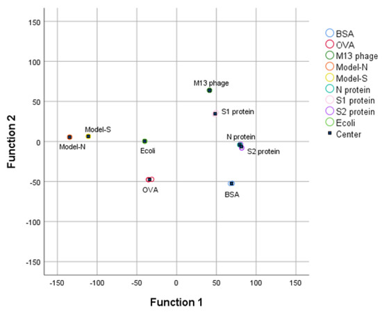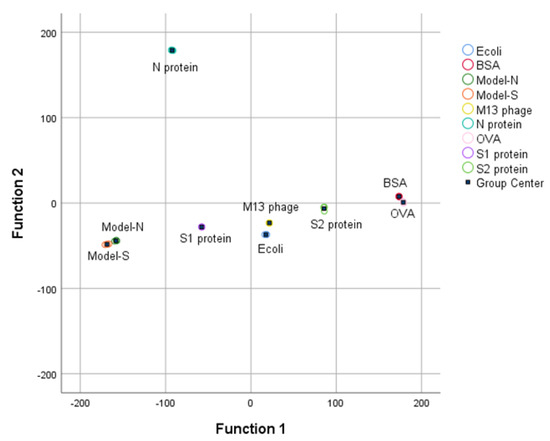 Then, the first four PCs were studied and added with group variables as a training sample set, and the data was processed by linear discriminant analysis (LDA). The first two linear discriminant functions were obtained and validated, as Table 3 shows, and the group center plot was drawn with a coordinate Function 1–2 based on LDA analysis (Figure 3). It can be summarized that the nine samples were separated, and the distribution of the samples was concentrated generally, which might show a possibility for the identification and distinguishment of the virus-like models from the other substances.