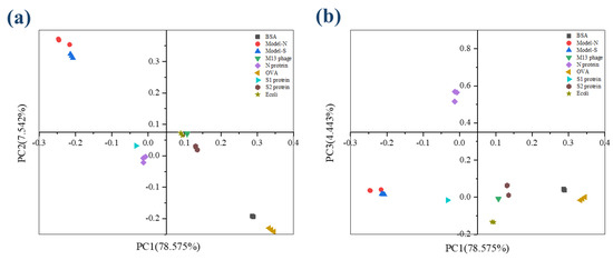 Apart from that, based on the results from cross-validation (see Table 7), 66.7% of Model−N can be identified correctly, and 33.3% for false recognition as Model−S. Beyond that, the rest of the samples could be identified and differentiated exactly with 96.3% accuracy for the classification of the whole samples. Therefore, the combination of RS and PCA−LDA has been an effective and satisfactory method for identifying and discriminating virus−like models and other samples.